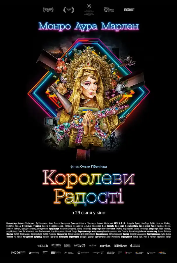 Сюжет:Історія трьох українських «королев радості» – відомої блогерки Монро, держслужбовця та військового, яких об’єднує любов до України та дреґ-культури. Це фільм про самопізнання, особисту свободу та силу спільноти. У часи повномасштабної війни головні герої_ні об’єднуються, щоб організувати благодійне дреґ-шоу на підтримку України та її захисників, доводячи, що мистецтво та культура можуть бути потужною зброєю опору та солідарності. Фільм розповідає історію трьох українських квір-персон: Монро – української квір-ікони, трансгендерної жінки, блогерки та громадської діячки; Артура Озерова аkkа Aura – дреґ-артиста та військового; Олександра Даніліна аkka Marlen Scandal – легендарної постаті української дреґ-культури. Нещодавно він пішов з життя через хворобу.